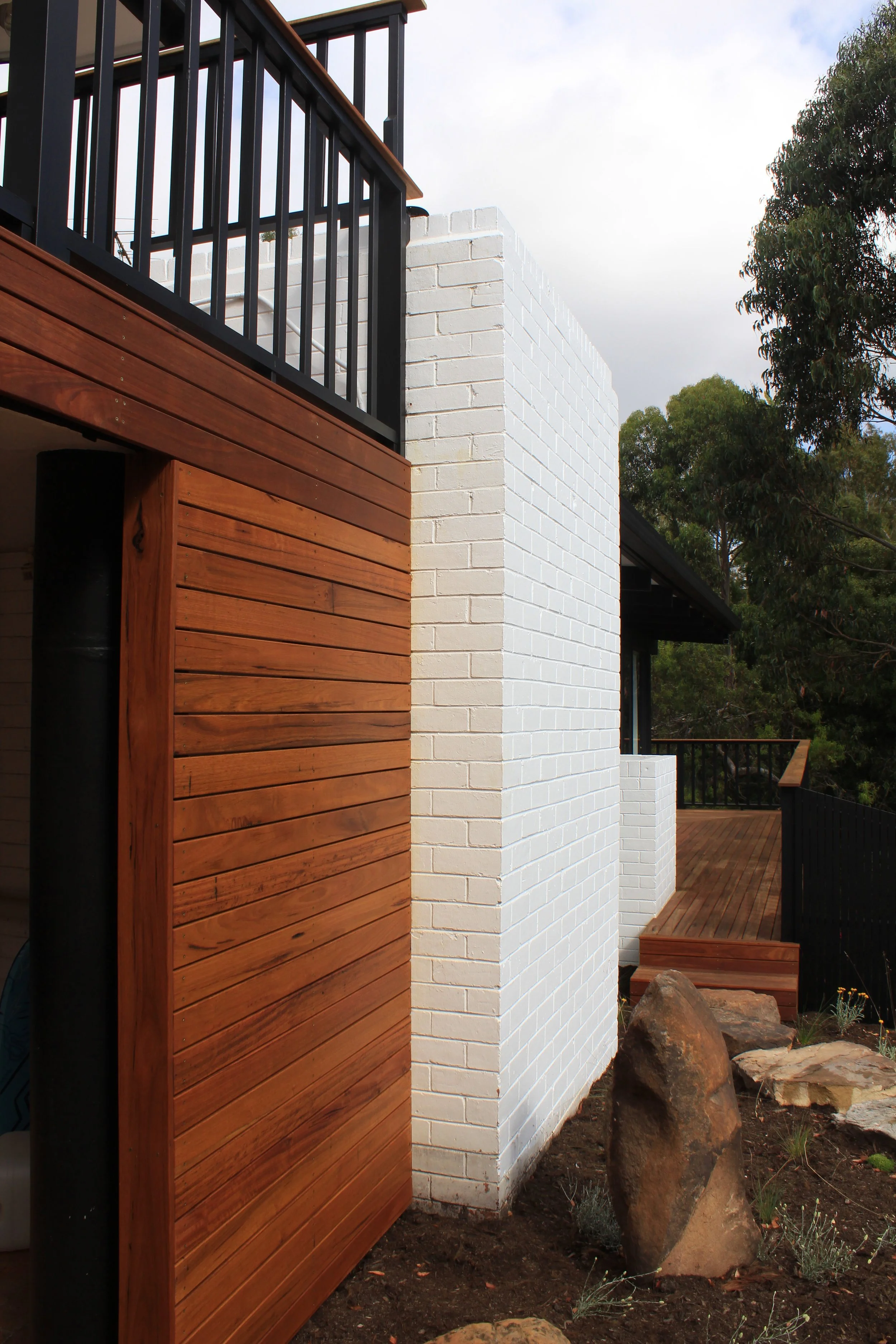Exterior view of a modern house with a combination of white brick and wooden siding, a balcony with black railings, and landscaped rocks and plants.